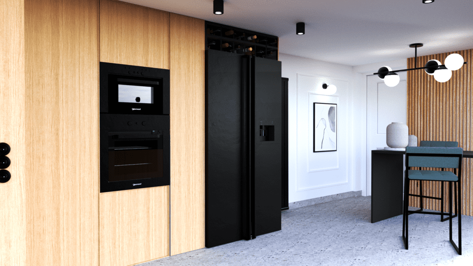 Klienci tego projektu to kolejni miłośnicy stylu loftowego. Uwielbiają czarne sprzęty i postawili na naturalny granitowy blat. Ciemne dodatki potrzebowały dobrej obstawy, nie mogło tu zabraknąć przytulnego drewna – na ścianie za wyspą pojawił się ryflowany panel i fronty z naturalnej dębowej okleiny.