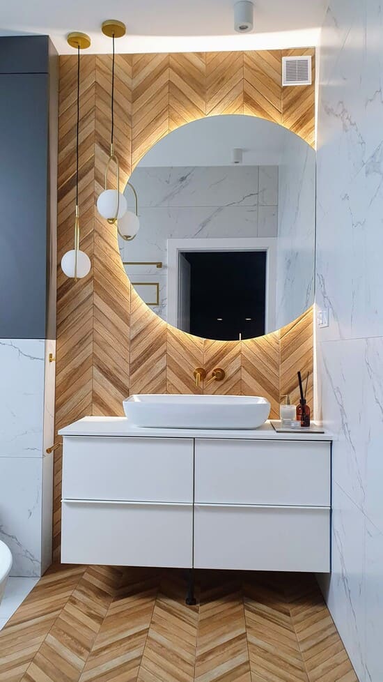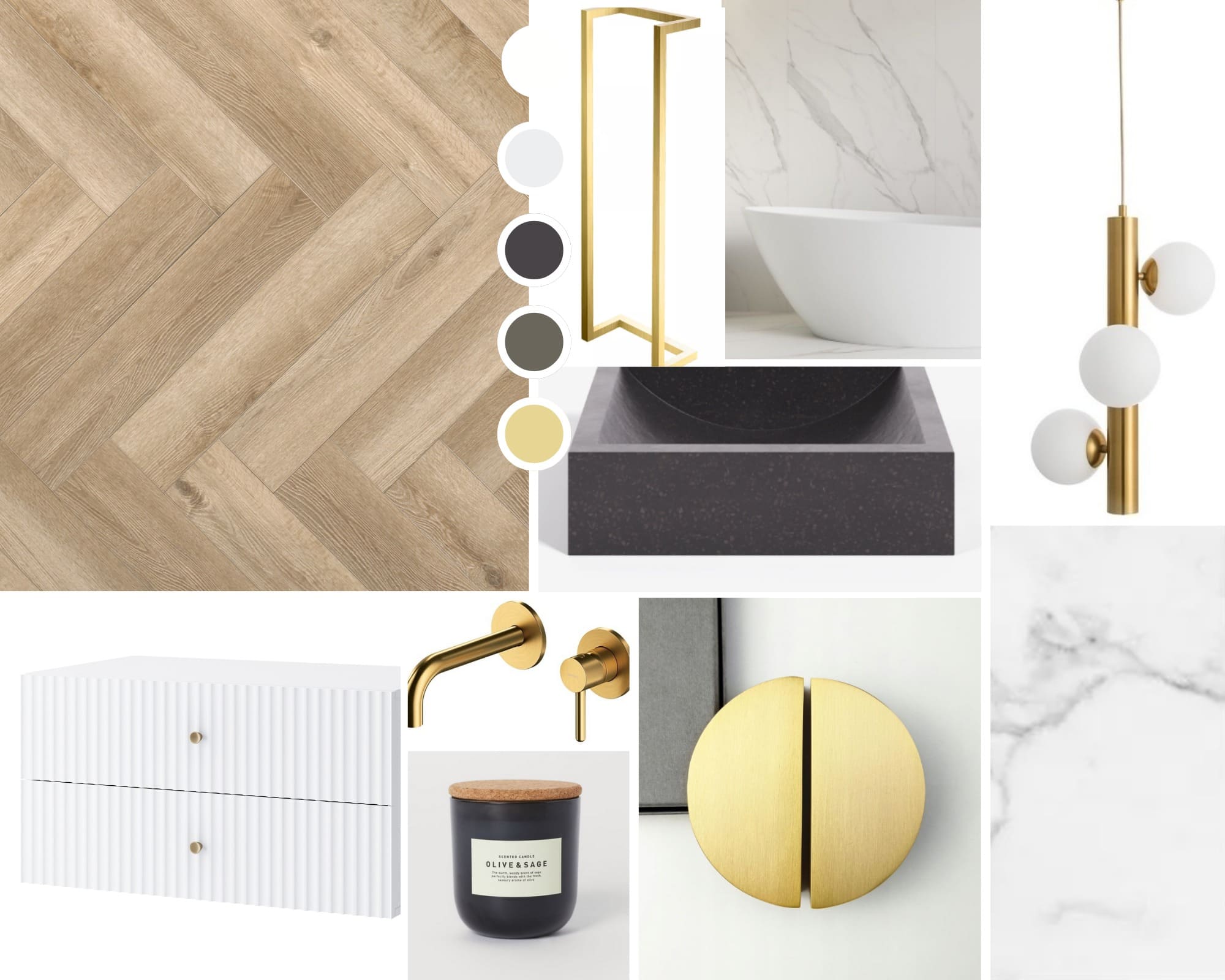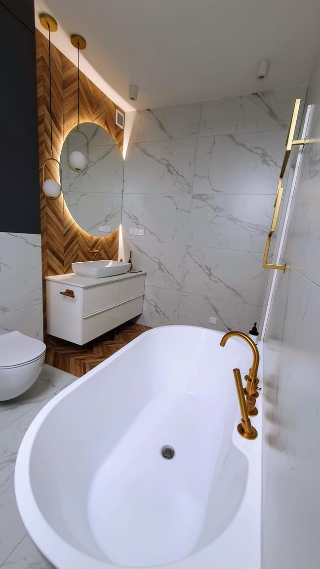 Łazienka na piętrze urządzona jest w eleganckim stylu, z wykorzystaniem złotych akcentów, antracytowych mebli, marmuru i jodełki francuskiej, co nadaje przestrzeni elegancji i wyrafinowania.