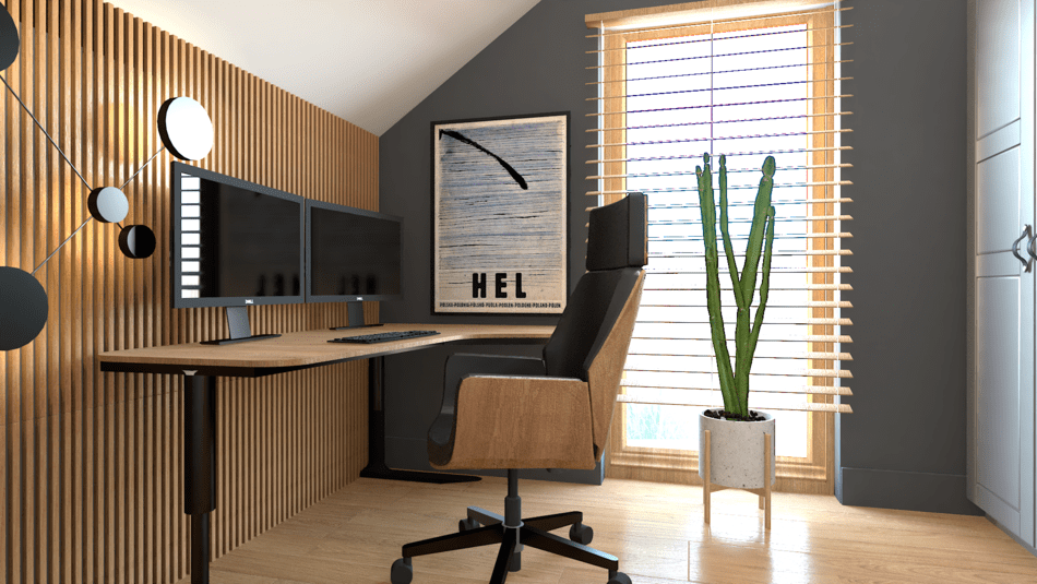 W salonie z kuchnią postawiliśmy na różne odcienie szarości, które w połączeniu z drewnianymi akcentami nadają wnętrzu elegancji i wyrafinowania. Dodatkowo, musztardowe hokery dodają wnętrzu wyrazistości.