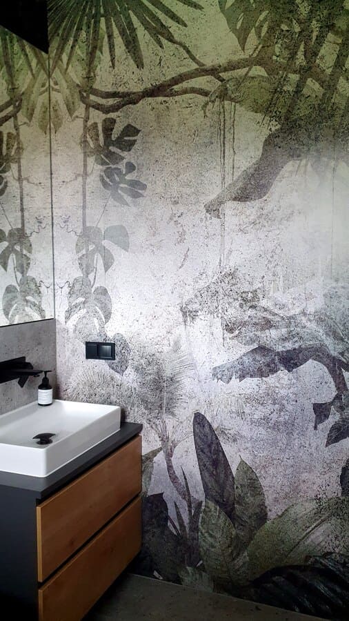 Łazienka na parterze łączy surowy beton z przytulnym drewnem, podkreślając industrialny klimat. Ciemne dodatki podkreślają tę atmosferę, a fototapeta z motywem jungle dodaje świeżości i natury.