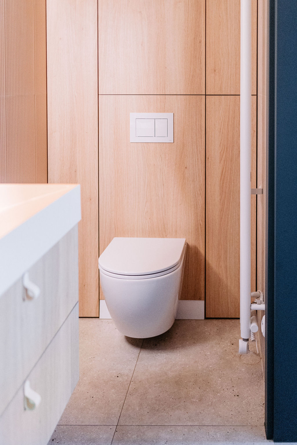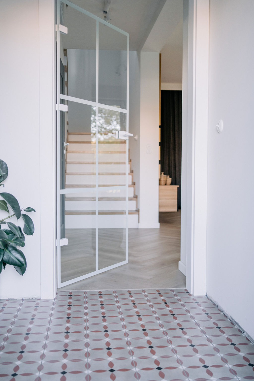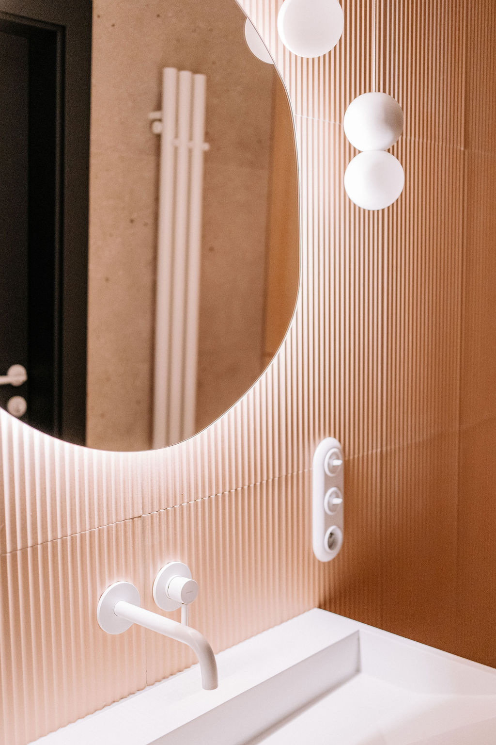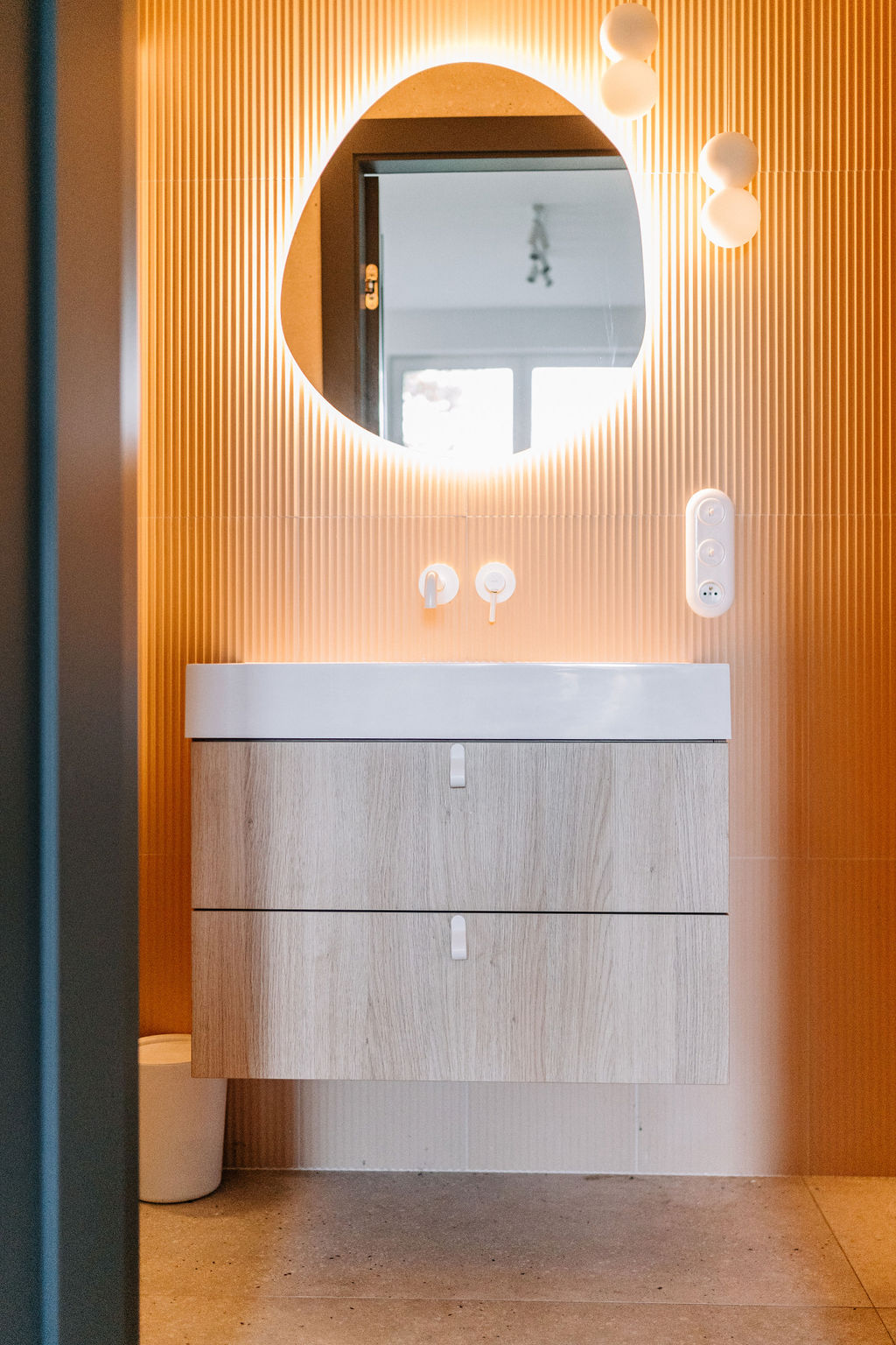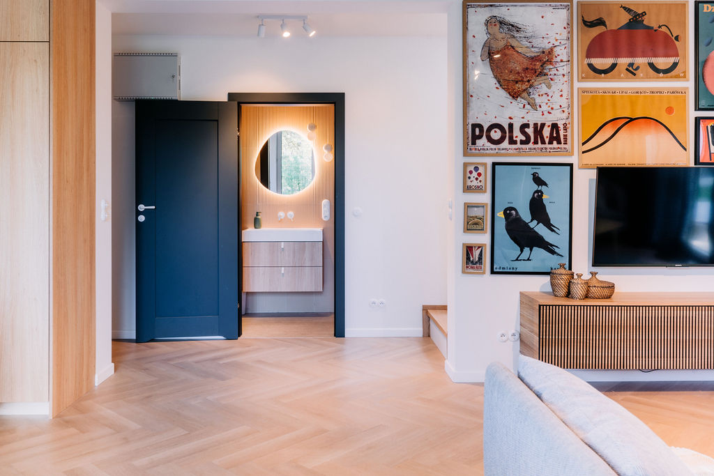 W łazience królują białe baterie i stylowe uchwyty, które nadają przestrzeni elegancki wygląd. Piękne podświetlane lustro o organicznym kształcie tworzy wyjątkowy klimat, a wszystko to sprawia, że to idealne miejsce na relaks po długim dniu. Cały dom łączy kolor i funkcjonalność, tworząc przestrzeń, która odzwierciedla osobowość rodziny.