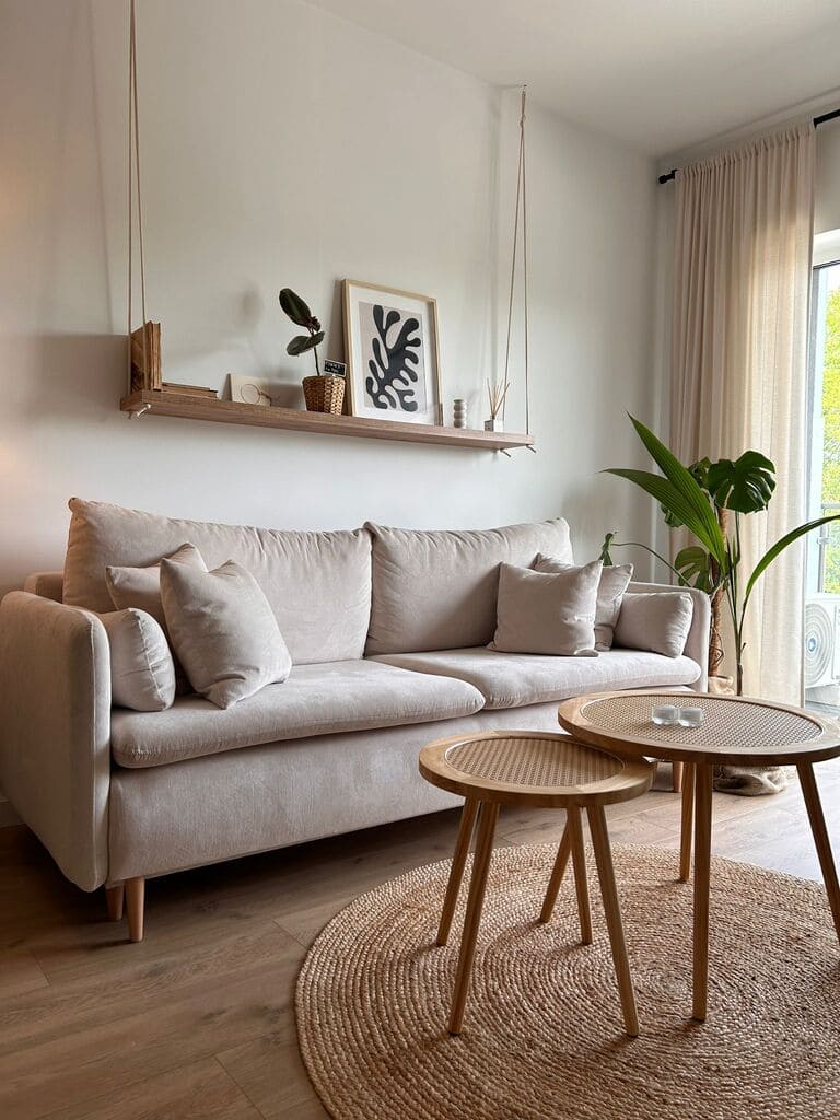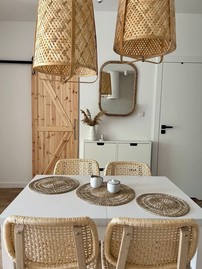 Połączenie bieli z drewnem i rattanem tworzy minimalistyczną, a zarazem ciepłą atmosferę, charakterystyczną dla stylu skandynawskiego.