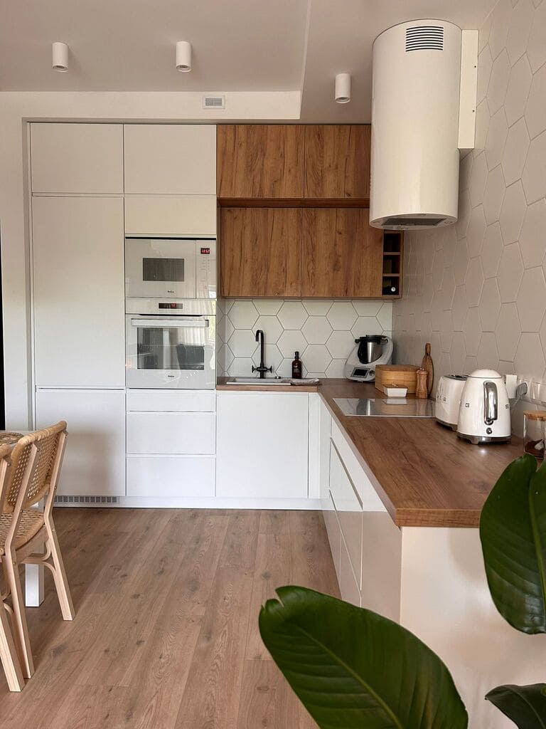 Biała kuchnia z drewnianymi blatami, symbolizująca prostotę i przestrzeń, idealnie współgra z rattanowymi krzesłami, wprowadzając subtelną egzotykę.